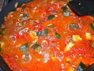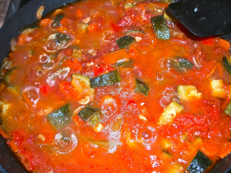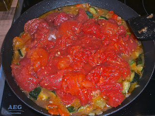 Vertemos en la sartén con la demás verduras y dejamos que cueza hasta que reduzca. Echamos sal y azúcar (para contrarrestar la acidez) a gusto de cada uno.