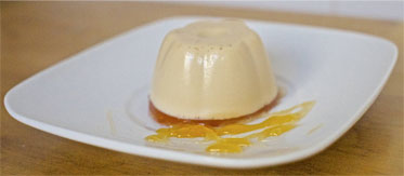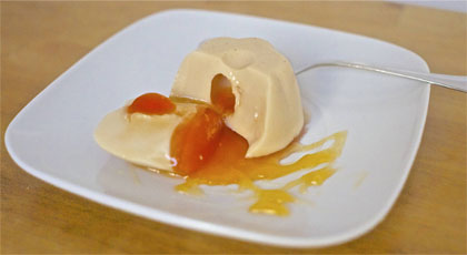 Una vez fría la panacotta hacer un agujero sin desmoldar y verter un poco de caramelo en los huecos.