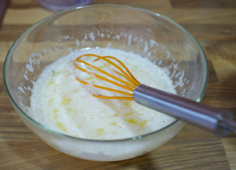 En otro bol ponemos los ingredientes líquidos junto el azúcar y mezclamos todo lo que podamos, cuanto más, mejor.